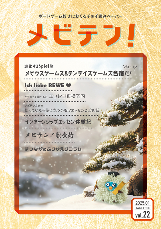 目次: ・進化するSpiel旅「メビウスゲームズ&テンデイズゲームズ合宿だ! イェーイ」・Ich liebe REWE・どうやって調べるの エッセン乗換案内・メビテンさまの「知っていたら役に立つかも!? エッセンこぼれ話」・インターンシップエッセン体験記・メビテン!歌会始・まつながのふりかえりコラム PDFで閲覧する